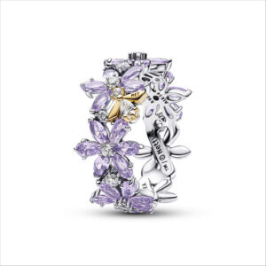 En su colección de destaca el anillo Herbarium Purple Flowers and Bee inspirado en jardines ingleses y motivos naturales. Combina flores moradas y la abeja —símbolo distintivo de Bridgerton— elaborada en plata de ley 925 con acabado dorado y decorado con cristales de orquídea morada.