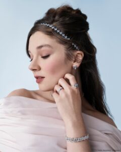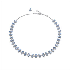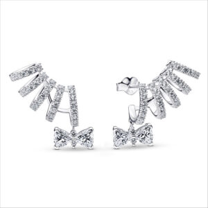 El collar Blue Bows juega con tonos azules y lazos brillantes, evocando la estética romántica de la serie. Elaborado en plata de ley 925, presenta una hilera de cristales azules engastados en un patrón de lazo y circonitas cúbicas. Los pendientes Climber Bright Bow reinterpretan el lazo con mayor audacia.