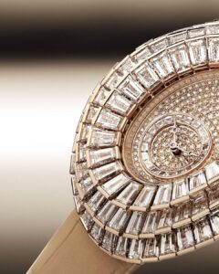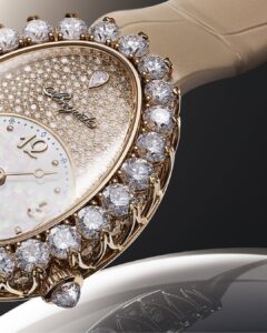 La esfera tiene una superficie totalmente engastada con 206 diamantes talla brillante y un índice del dial del tiempo formado por 20 diamantes talla baguette. Además, hay pétalos que surgen de la caja y que recrean la flor de frangipani.