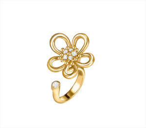 Su inspiración viene de la silueta de una corola calada en oro amarillo y diamantes. Los pétalos y las líneas que delinean la elegante forma redondeada de la flor evocan la fluidez de una cinta, un guiño a otra fuente de inspiración para Van Cleef & Arpels: la moda.