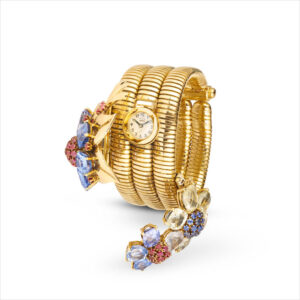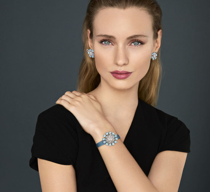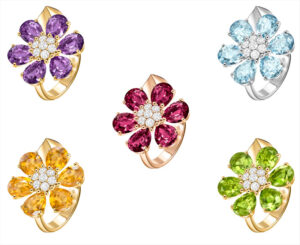 La flor es extraíble y puede llevarse como pulsera, broche o colgante. Citrino y oro amarillo, rodolita y oro rosa, aguamarina y oro blanco se combinan en la correa de satén que acompaña a cada reloj.